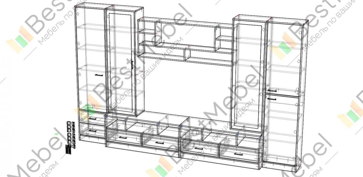 Стенка Валенсия 3 BMS компактно разместит одежду, книги, предметы декора и телевизор с аксессуарами. Композиция в современной стилистике включает в себя двойную широкую тумбу, симметричные витрины, стеллаж, книжную полку и два пенала - распашной и оснащенный выдвижными ящиками. Строгую геометрию формы подчеркивает яркий контраст темных и светлых древесных тонов. Купить стенку Валенсия 3 BMS, изготовленную по индивидуальным размерам, вы сможете в нашем интернет-магазине.
