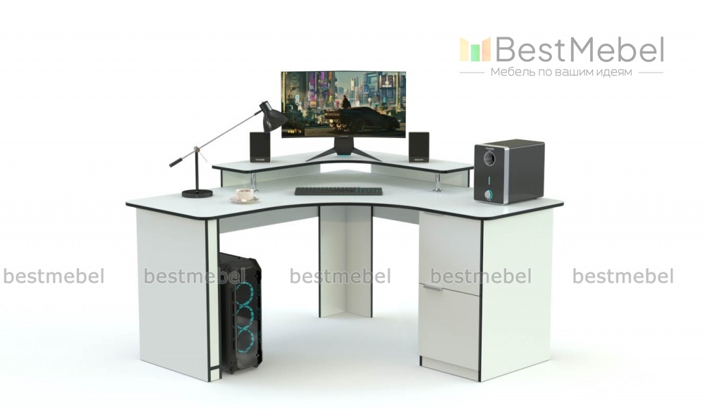 Геймерский стол Юпитер 7 BMS органично вписывается в большинство современных интерьеров благодаря лаконичному дизайну и исполнению в нейтральном белом цвете. За счет угловой конструкции модель экономно использует пространство и имеет просторную рабочую поверхность. Значительно расширяют функционал стола надстройка для монитора и распашная тумба с двумя отделениями для хранения рабочих материалов. Купить геймерский стол Юпитер 7 BMS вы сможете выгодно в нашем интернет-магазине.