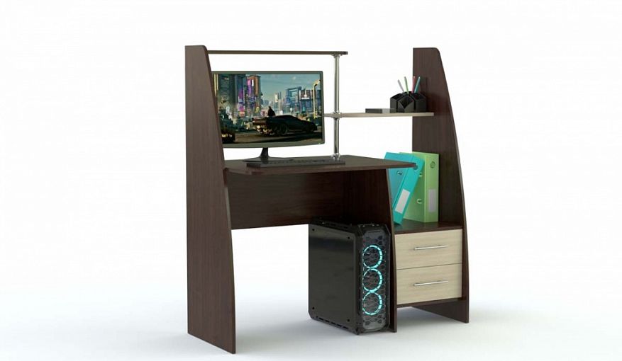 Интересная модель наверняка придется по вкусу любителям неординарных решений. Компьютерный стол Школьник-Стиль М-01BMS станет украшением в комнате подростка или же будет стильно выглядеть в современном офисе. Основная часть стола представляет собой просторную рабочую зону, место для компьютера и большую верхнюю полку. Боковая часть имеет очень необычный вид в форме паруса, большую тумбу с двумя ящичками и открытую верхнюю полку. Обе части соединены никелированной штангой. Купить данную модель вы можете, подобрав другие цвета.