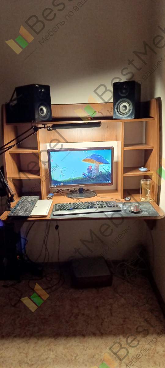 Приобрёл навесной стол длиной 1000 мм.Собрал и подвесил сам без проблем - нормальная инструкция, сборка несложная, повозился только с монтажом.В центральной нише расположил ноут, и для мыши места осталось мало. Так что лучше при такой компоновке брать подлиннее стол. Ячейки по бокам невысокие, из-за чего они неудобные для использования. Если было бы выполнено только одно разделение, получилось бы лучше.