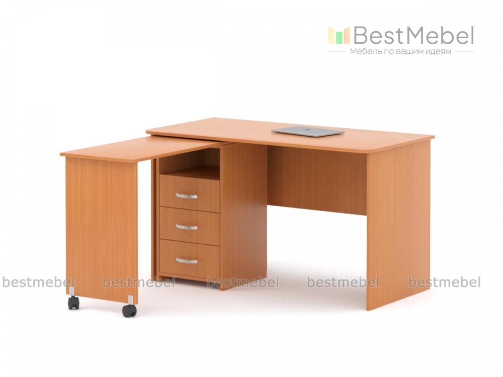Стол компьютерный Баст 3 BMS – практичный вариант для дома или офиса с функцией трансформации. Благодаря поворотному модулю на колесиках прямой стол с безопасно скругленной по углам столешницей легко превращается в угловой. Модель классического дизайна выполнена в древесных тонах и оборудована тумбой с тремя выдвижными ящиками и нишей для удобного хранения канцелярских мелочей и бумаг. Купить стол компьютерный Баст 3 BMS и обустроить комфортное рабочее место вам поможет наш интернет-магазин.
