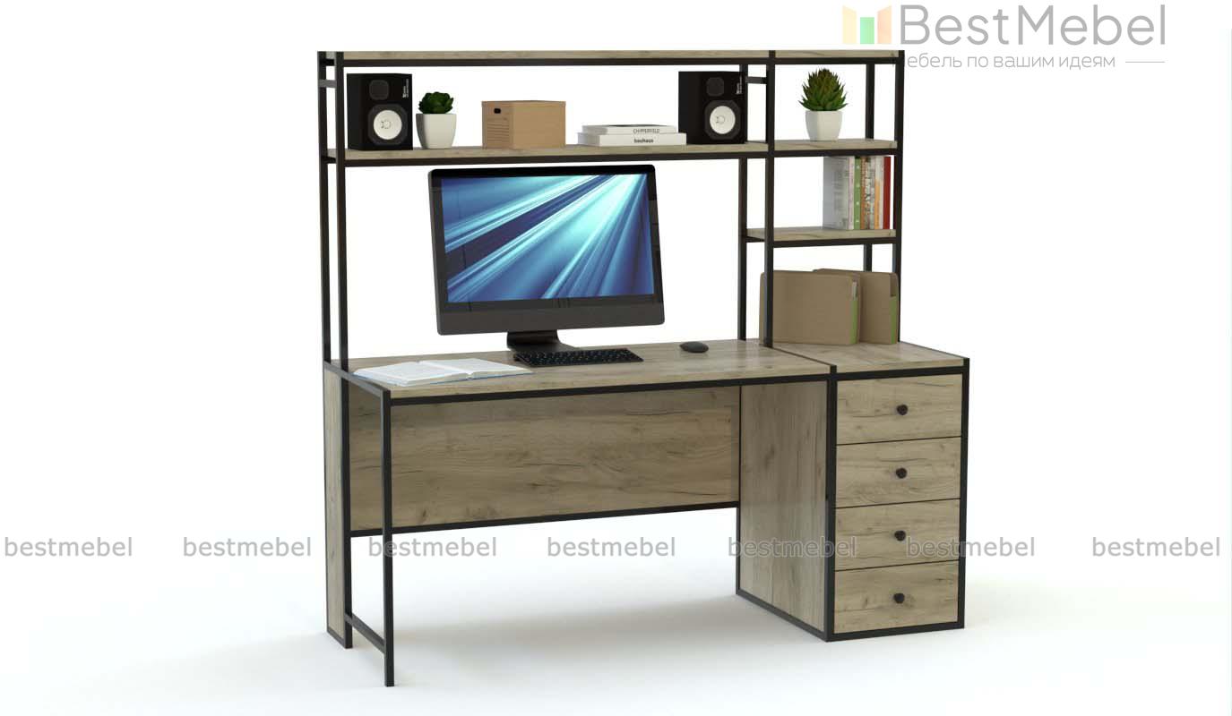 Стол компьютерный Ирис 2 BMS выполнен из ЛДСП в крафтовых древесных тонах и металла. Прочная и в то же время визуально легкая, модель станет прекрасным выбором для меблировки лофта. Практичная конструкция включает в себя просторную прямоугольную столешницу, тумбу с четырьмя выдвижными ящиками и надстройку с открытыми полками для размещения периферийных устройств и рабочих материалов. Купить стол компьютерный Ирис 2 BMS приглашаем в наш интернет-магазин с выбором фурнитуры и цвета по каталогу.