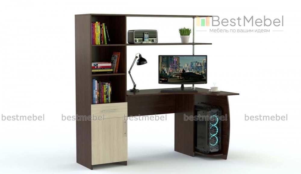 Если вы ищете стильную и красивую модель, обратите внимание на Профи М BMS. Он очень симпатичный, имеет красивые формы, стильную фурнитуру и выполнен в модных цветах. Одна сторона отведена для расположения компьютера, а вторая половина представляет собой довольно большой шкаф-пенал с закрытой тумбой и открытыми полками. Дополнительным украшением стола стала никелированная штанга, поддерживающая верхнюю полку. Купить компьютерный стол Профи М BMS можно для офиса и для дома.