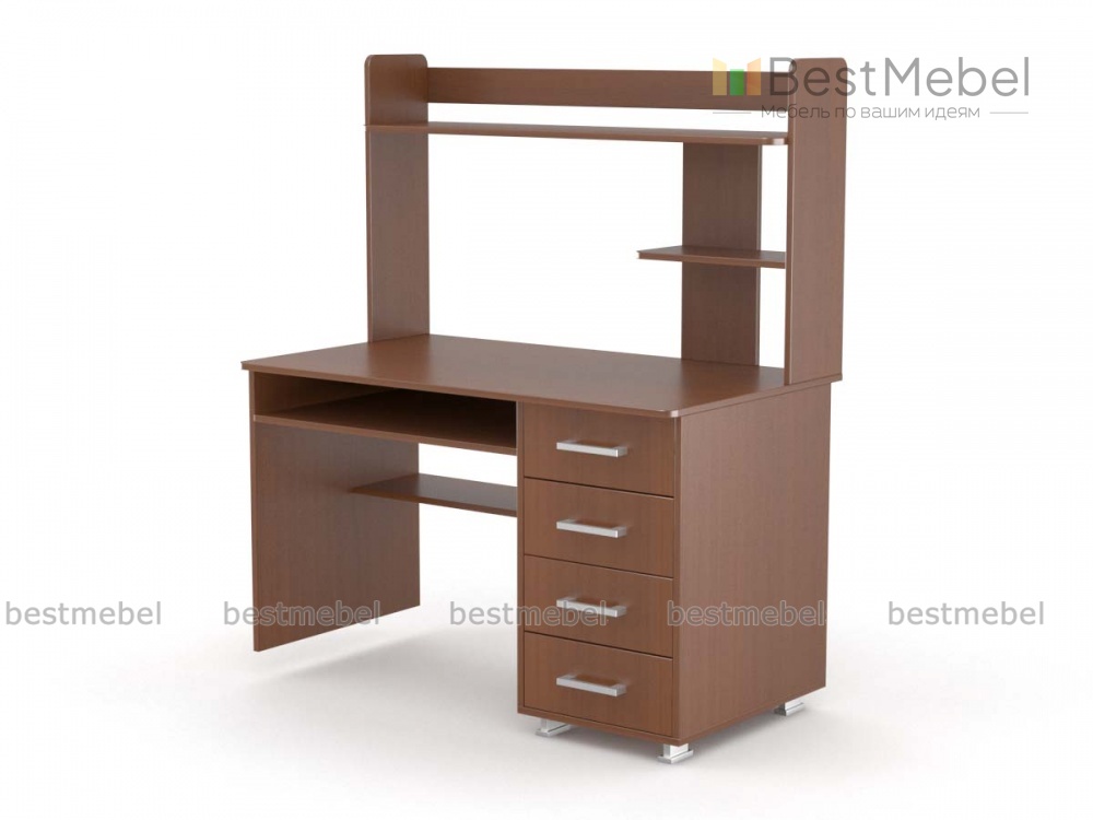Наш интернет-магазин предлагает Вам купить недорого стол компьютерный Виспар. Данное изделие, несомненно, станет одним из главных помощников в учебе. Модель имеет просторную столешницу, на которой без проблем поместится монитор, клавиатура и мышь. Для хранения личных вещей предусмотрена отдельная тумбочка с 4-мя выдвижными ящиками. Складывать тетради, книги или печатную бумагу можно в нишу либо на одну из полок, расположенных на специальной подставке (еще одна полка есть под столом).