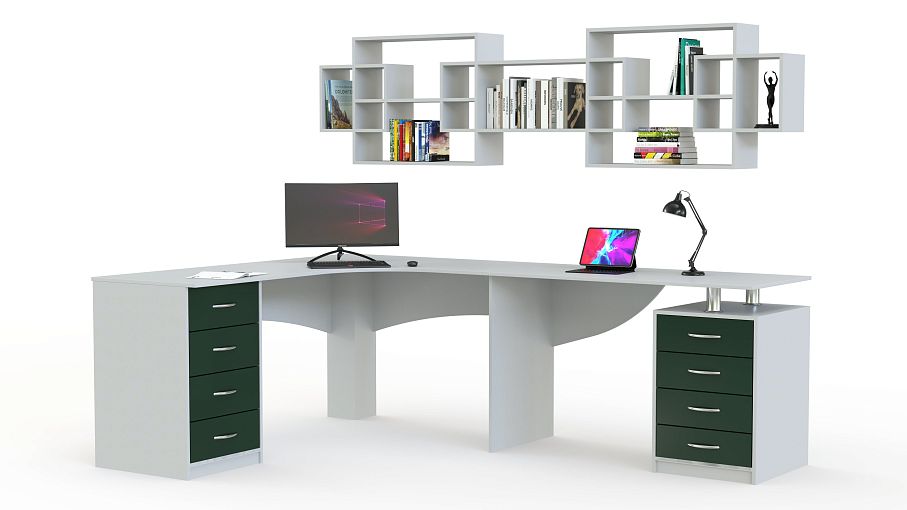 Угловой письменный стол для двоих Прима 172 BMS гармонично впишется в интерьер детской и поможет обустроить комфортную зону для учебы и творческих занятий. Выполненный в сером цвете с фасадами темного оттенка, стол отличается визуальной легкостью, а практичная форма сэкономит пространство. Композиция включает в себя угловой стол с двумя тумбами и навесные открытые полки для книг, игрушек и декоративных мелочей. Купить угловой письменный стол для двоих Прима 172 BMS приглашаем к нам в интернет-магазин.