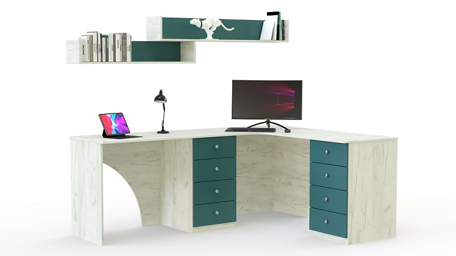 Угловой письменный стол для двоих Фреско 47 BMS – прекрасный выбор для комнаты девочек, сочетающий в себе современный дизайн и практичность конструкции. Каждое рабочее место оборудовано тумбой с выдвижными ящиками для канцелярских принадлежностей, а просторные столешницы позволят разместить ноутбук и необходимые мелочи. Дополняют композицию навесные книжные полки. Купить угловой письменный стол для двоих Фреско 47 BMS, выполненный в сочетании древесных тонов и аквамаринового, приглашаем в наш интернет-магазин.