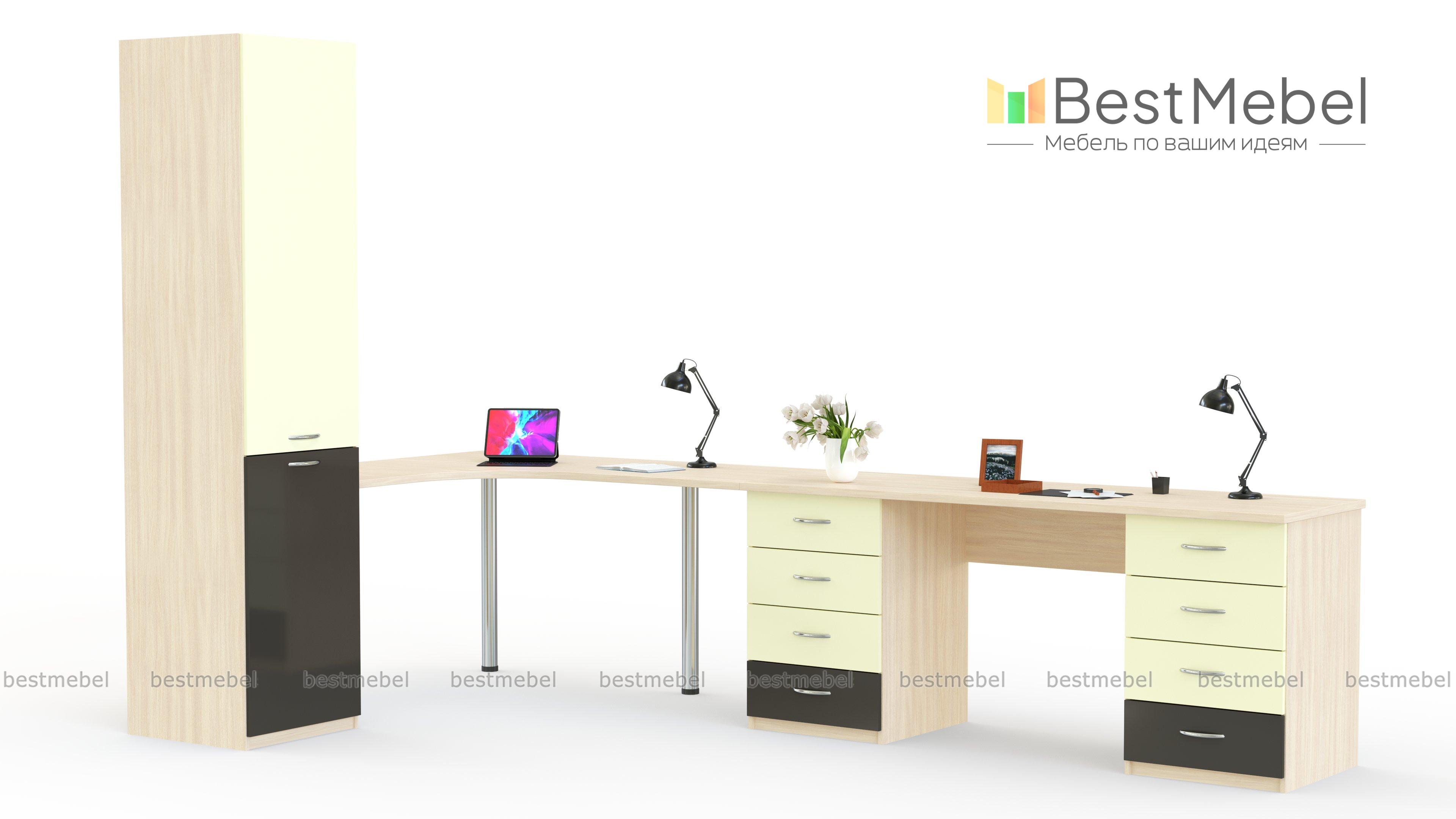 Угловой письменный стол для двоих Пилот 65 BMS поможет эффективно использовать пространство возле окна и обеспечит рабочим местам хорошую естественную освещенность. Вписанная в интерьер по всей ширине комнаты, модель оборудована широкой столешницей, двумя тумбами с выдвижными ящиками для хранения канцелярских принадлежностей и пеналом с полками. Корпус белого цвета дополняют бирюзовые и графитовые фасады в глянце с эффектом металлик. Купить угловой письменный стол для двоих Пилот 65 BMS приглашаем в наш интернет-магазин.