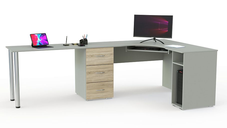 Угловой письменный стол для двоих Вента 72 BMS располагается вдоль окна, что обеспечивает рабочей поверхности отличную освещенность. Г-образная столешница на регулируемых хромированных опорах дополнена двумя тумбами, выкатной панелью для клавиатуры и надстройкой под монитор. Выполненный в универсальных серых тонах с древесным фасадом, стол органично впишется в интерьер современной подростковой комнаты. Купить угловой письменный стол для двоих Вента 72 BMS вы сможете в нашем интернет-магазине с учетом оптимальных параметров.