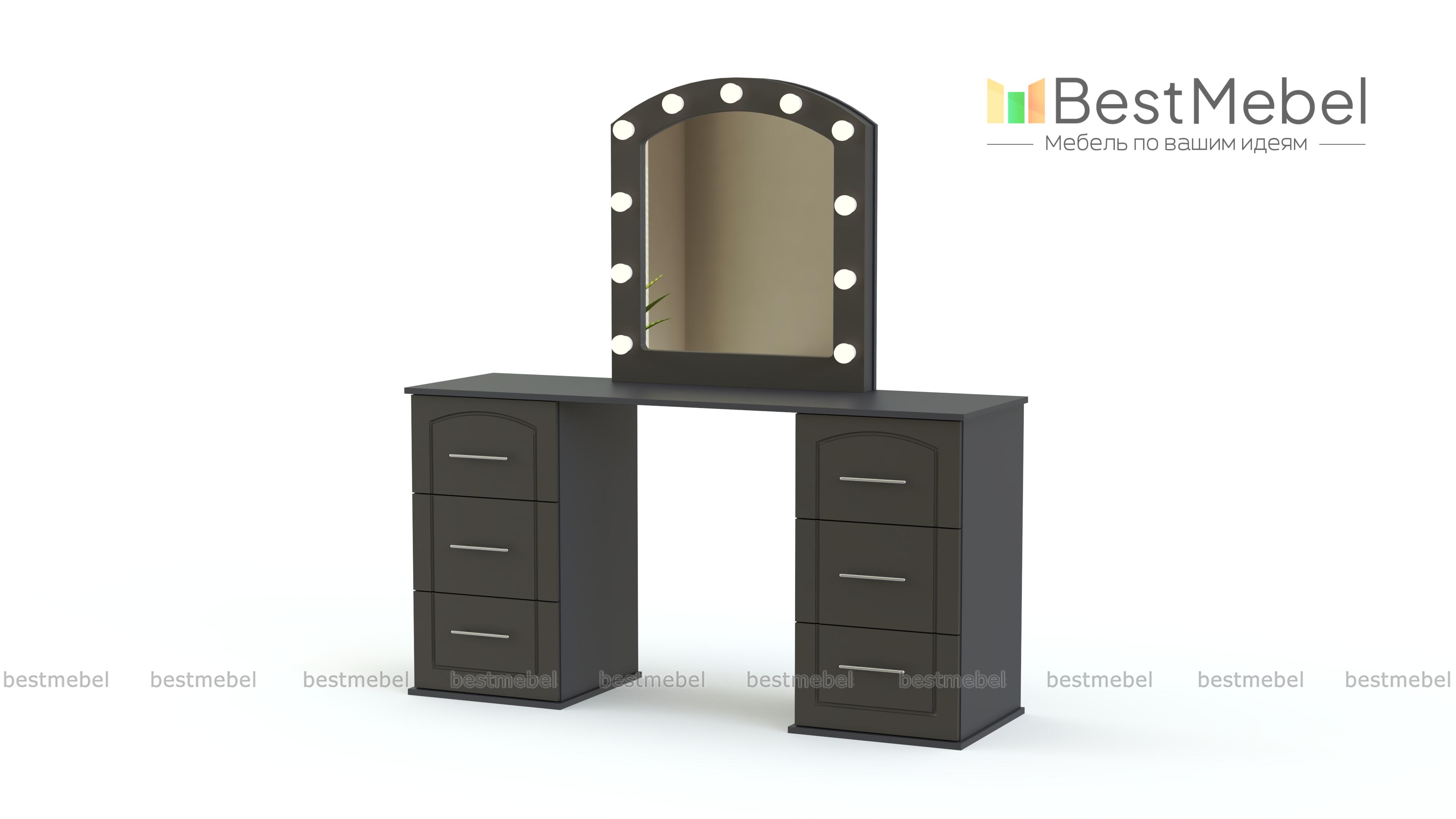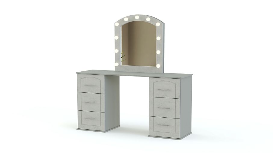 Туалетный столик Флер 42 BMS – это классическая модель для уютного спального интерьера. Фрезерованная модель в серых тонах украсит комнату и обеспечит комфортные условия для ухода за собой. Столик имеет просторную рабочую поверхностью и оборудован двумя тумбами с выдвижными ящиками, в которых компактно разместятся уходовые средства и аксессуары. На столешнице закреплено элегантно скругленное панно с зеркалом и расположенными по периметру светодиодными лампочками. Купить туалетный столик Флер 42 BMS вы сможете в нашем интернет-магазине.