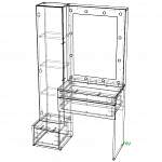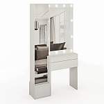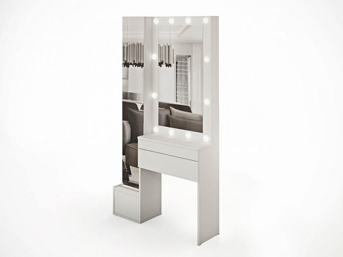 Необычный комплект с подсветкой светодиодными лампочками будет прекрасным дополнением современного спального гарнитура. Комфортное размещение средствам для макияжа и многому другому обеспечат два выдвижных ящика и полки бокового шкафа. Но особенно интересно в этой модели нестандартное решение зеркальной дверцы, которая в закрытом виде представляет собой зеркало в полный рост, редкое в туалетных столиках, а в открытом становится единым полотном с боковиной. В белом цвете столик Mak BMS смотрится легким и элегантным.