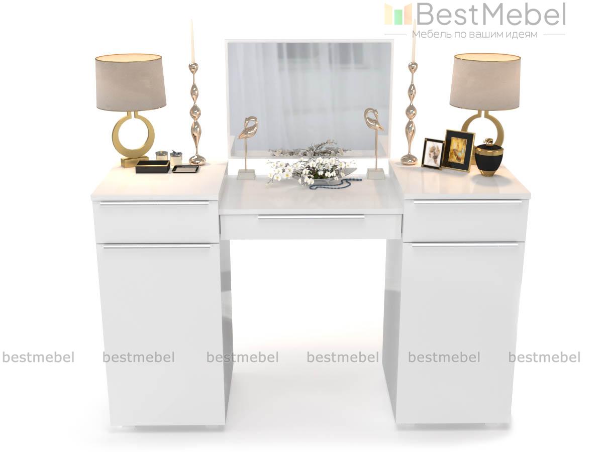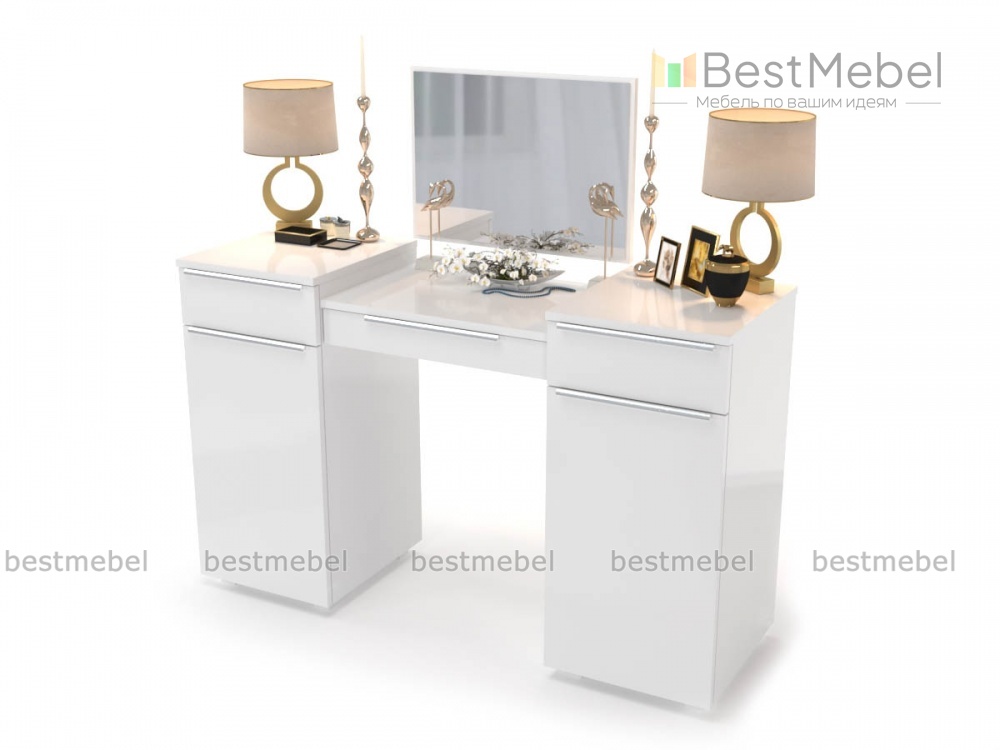 Одно из простых, и, в то же время, оригинальных решений для современной спальни. Элегантный туалетный столик оборудован двумя вместительными комодами, соединенными столешницей с выдвижным ящиком. Панель с зеркалом – настенная, поэтому возможно как горизонтальное, так и вертикальное крепление. Фасады туалетного столика Ст-1 BMS выполнены в глянцевом материале и декорированы удлиненными ручками стального цвета. Благодаря большому количеству свободных поверхностей, на столике разместятся и фото, и сувениры, и ваза с цветами.