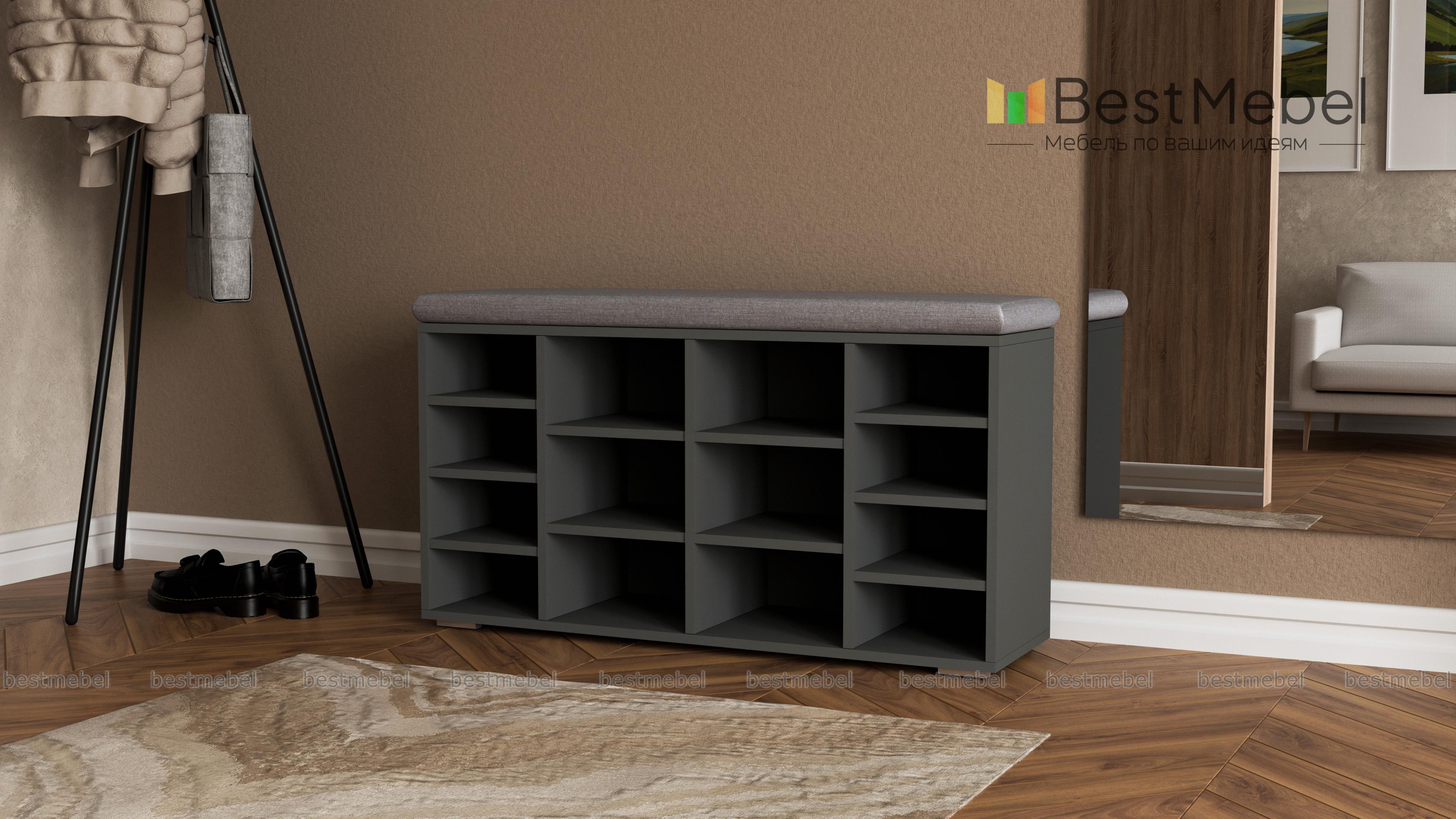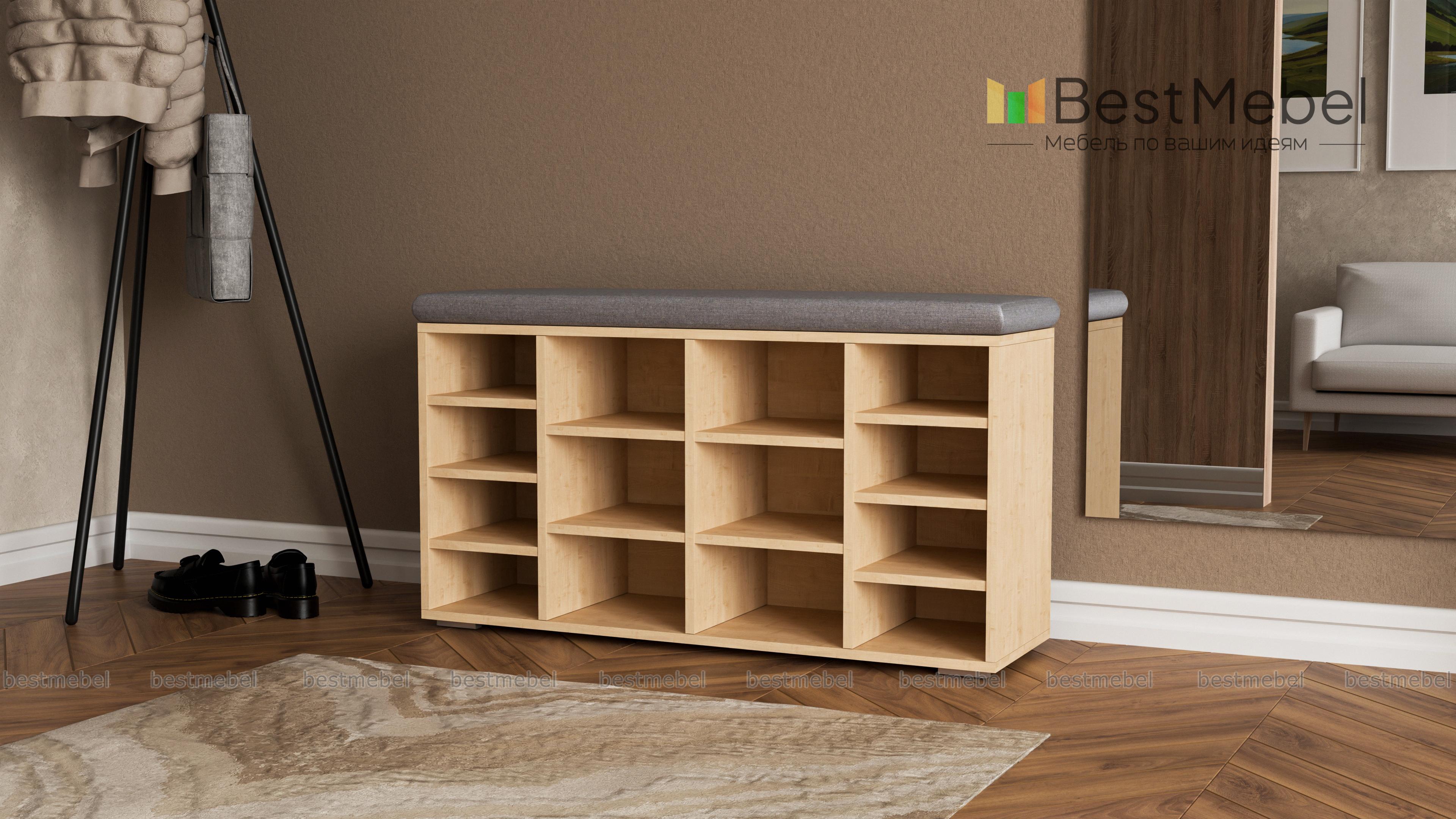 Тумба для обуви Шелф BMS гармонично впишется в современные интерьеры и поможет оптимизировать хранение обуви, уходовых средств и аксессуаров. Широкая низкая модель оборудована нишами разных размеров и просторной столешницей, которую элемент в мягкой обивке превращает в комфортную скамью. Открытая конструкция позволит быстро найти нужную пару и обеспечивает содержимому проветривание. Купить тумбу для обуви Шелф BMS по отличной цене приглашаем в наш интернет-магазин.