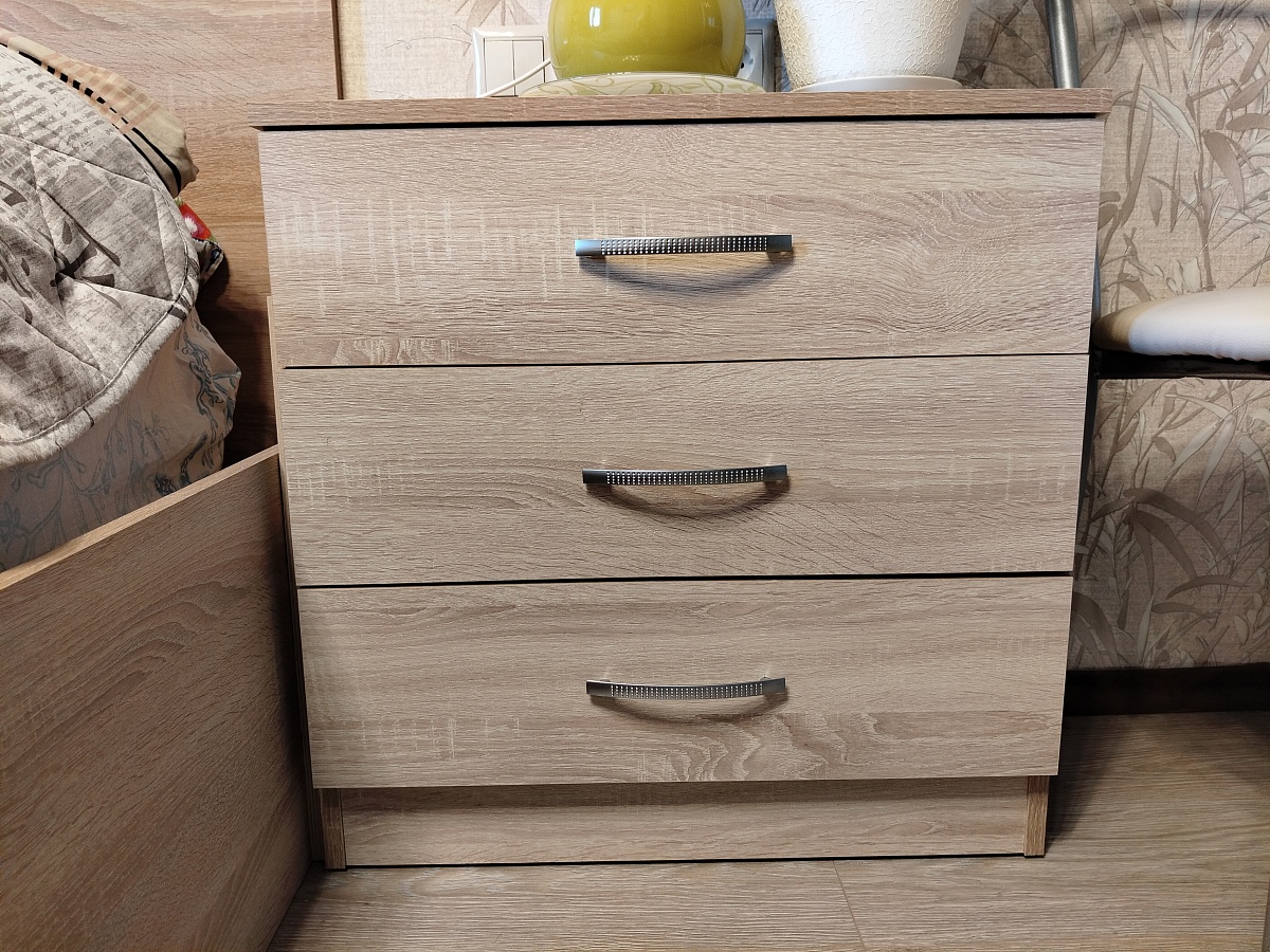 Заказали тумбу по своим размерам, в цвете Дуб сонома.  Вчера получили, сегодня муж с сыном собрали ее. Мне очень она нравится. Быстрое изготовление и доставка. Все детали промаркированы и сборка не занимает много времени.  Никаких  дефектов обнаружено не было. Жду еще комод на кухню.