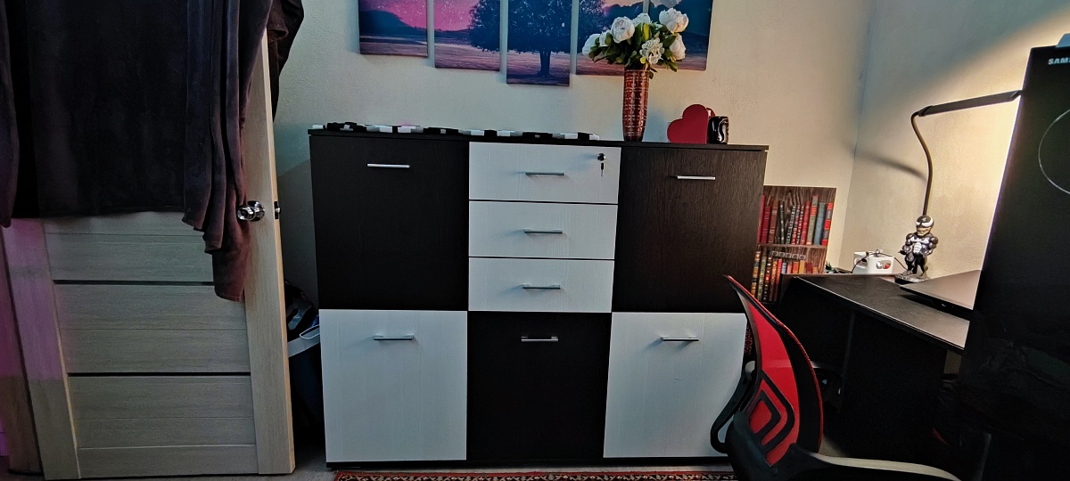 Прекрасный комод, привезли через день, по индивидуальным размерам. Красивый вместительный, качество отличное. Осталась очень довольна. Все комплектующие  на месте и даже с запасом. 1131734 заказ