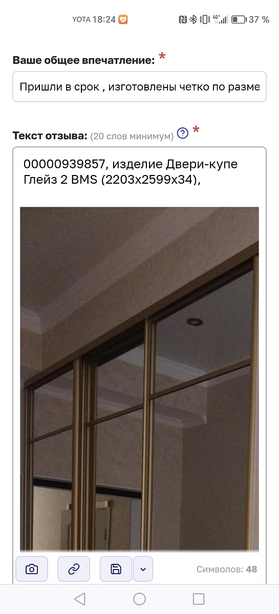 Заказ 00000942180, изделие ИН Антресоли по замеру (844х395х865)Заказывала в компании БэстМебель антресоли по индивидуальным размерам. Сначала вызвала замерщика, который всё померил, обговорили как будет выглядеть изделие. Потом мне прислали чертежи и расчёт. Антресоли изготовили быстро, привезли, потом установили. С качеством нет проблем, всё как я хотела. Спасибо!