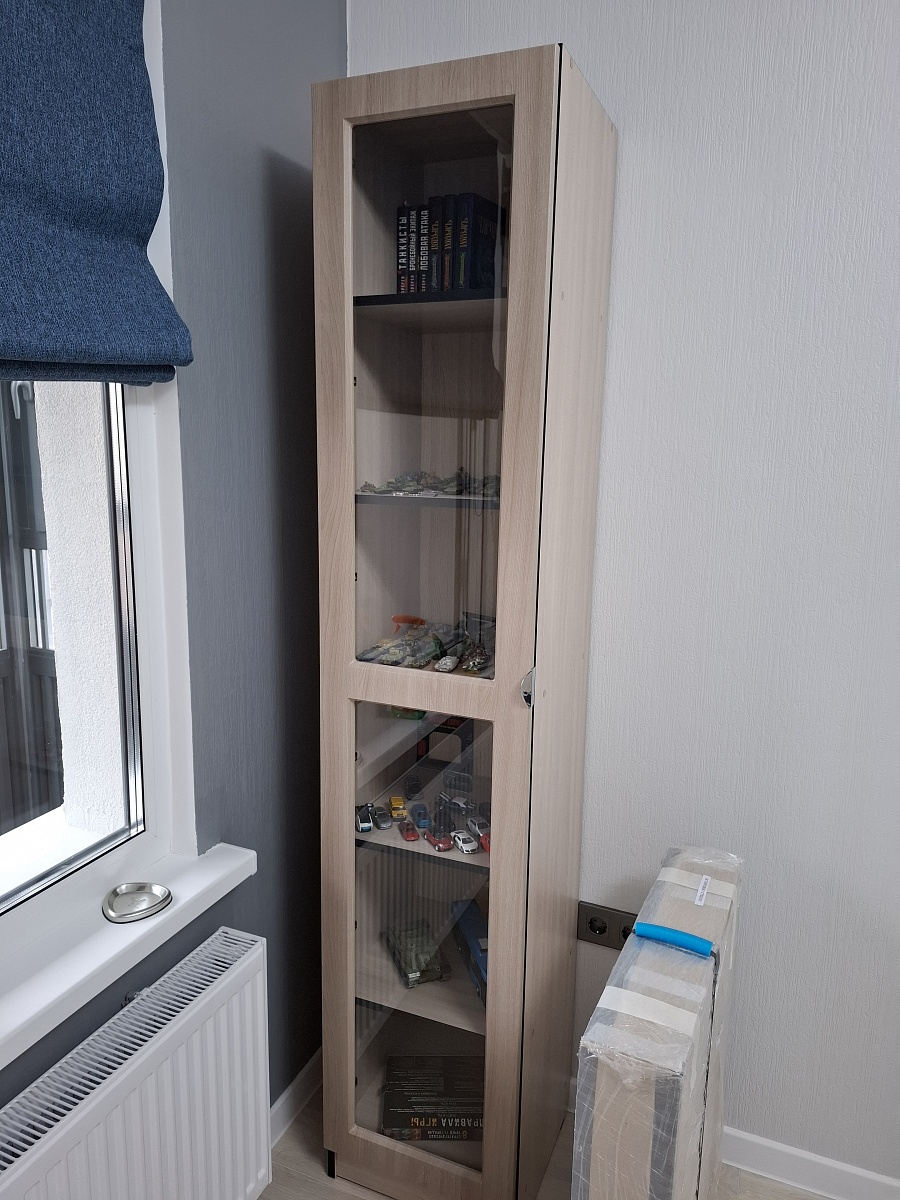 Шкаф смотрится идеально, вписался в уголок как родной. Был нужен шкаф для коллекции с дверями, так как дома кот, который вечно всё сносит. Выглядит маленьким, но всё влезло идеально. Смогла сделать его в цвет и стиль стола (ясень шимо светлый, чёрная кромка и такая ручка). Размеры: 400×2020×400. Всем довольна, изделие пришло без косяков.