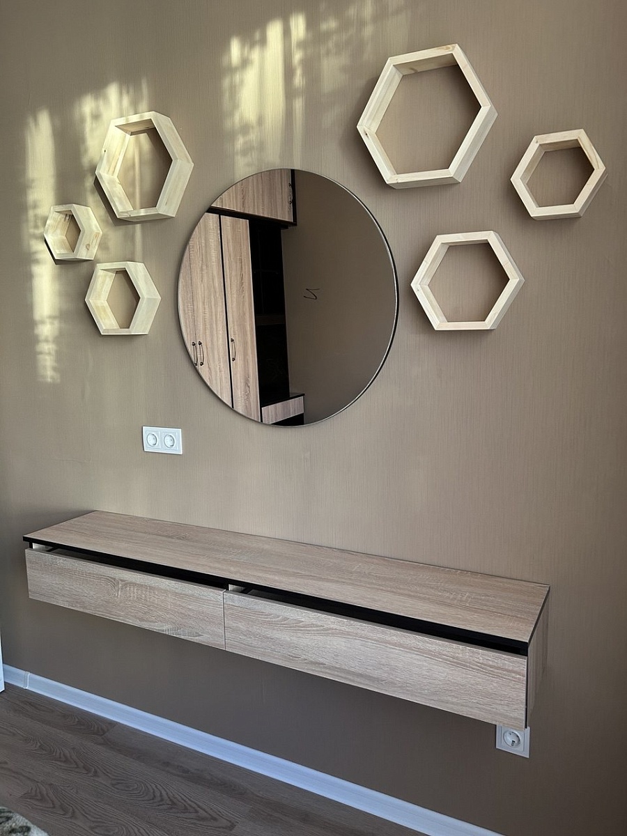 Это третий товар, заказанный в BestMebel. До этого заказывали шкаф в коридор и шкаф в спальную комнату. Туалетный столик подбирали под уже купленную кровать и шкаф.Хорошо,;что можно размеры выбрать под себя.Большой плюс - бонусная система - за предыдущий заказ прилетело 3 с лишним тысячи бонусов, которые списали при оформлении данного столика.Изначально оператор говорил, что крепления к стене в комплекте не идут. Все было в комплекте - и крепления стола и крепления к стене.