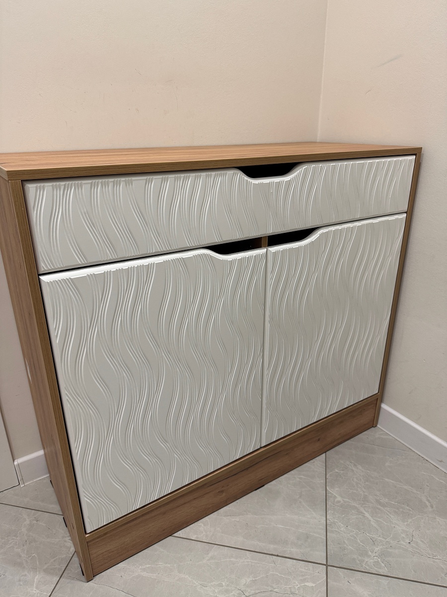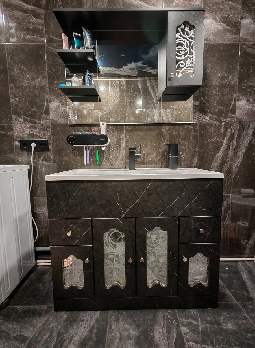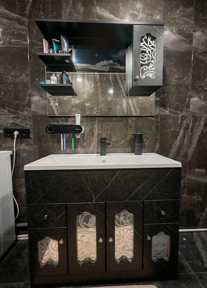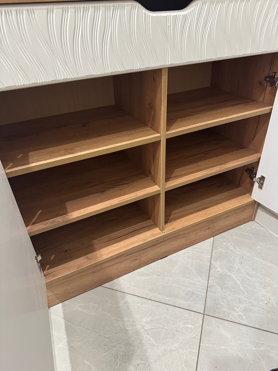 Заказал тумбу под свои размеры. 1000*900*400.Если кому будет полезно, на фото корпус дуб крафт, фасады МДФ Белый матовый софт тач 93005-48 с фрезеровкой "Арфа".Всё идеально подогнано.Единственное, что опечалило - плохо работает доводчик (брал стандарт). Рекомендую переплатить за импортный. Но общее впечатление положительное.Отдельное спасибо менеджеру, которая подтверждала заказ, что удалось обсудить каждую мелочь.