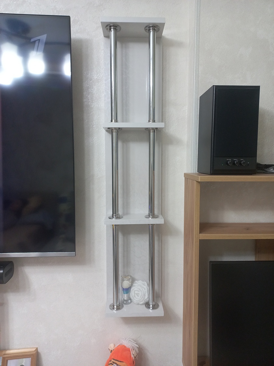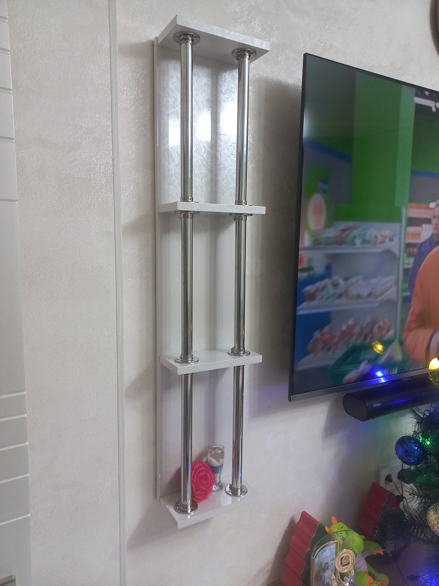 Заказал 2 полки из МДФ, повесил в нишу около телевизора, мне понравилось.