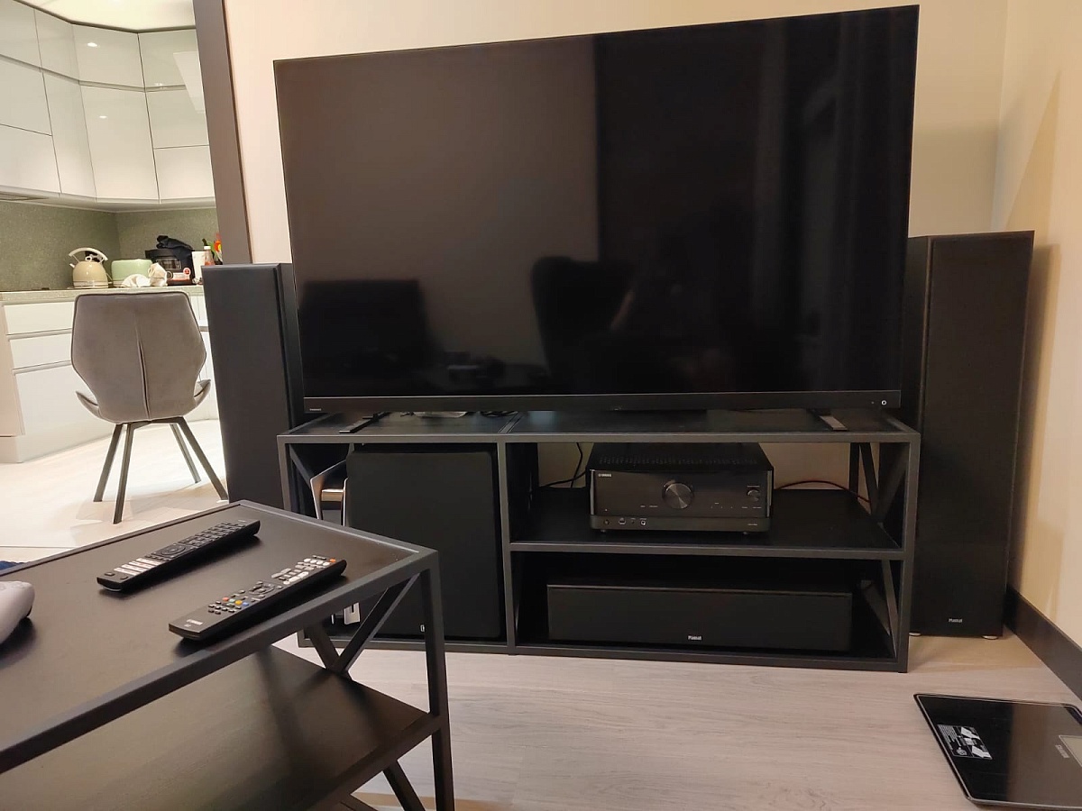 Сделали очень быстро (меньше недели) и качественно под наши размеры (чтобы влезли и плойка и сабвуфер), также столик на колесах.
