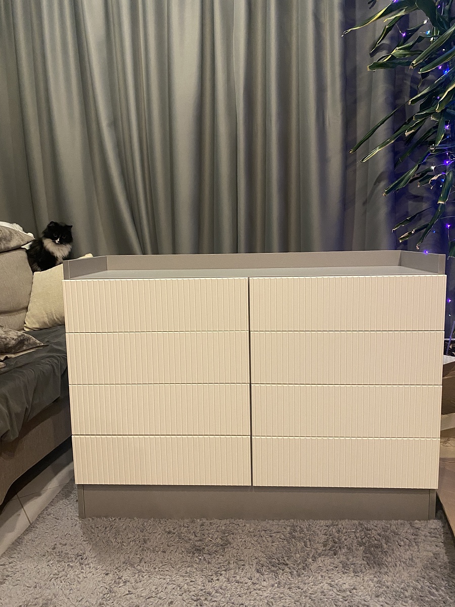 Купили мы этот комод из раздела «распродажа» за 20 тысяч. Доставка была очень веселая. Сначала привезли часть нашего комода , часть чужого , потом был довоз двух деталей , потом еще один довоз остальных… Стали собирать - комод , ящики собрали , а с механизмами push to open возникла проблема. Вызвали их сборщика. Собрал , но скидку не сделал за то что половина уже была собрана. Ну ладно , слава богу доехал и собрался 🤭. По впечатлениям- красивый , не вместительный совсем , половина не поместилось из старого икеевского комода ☹️ есть места со сколами к сожалению. Механизмы работают с усилием. Я по другому это себе представляла , ну может разработаются еще
