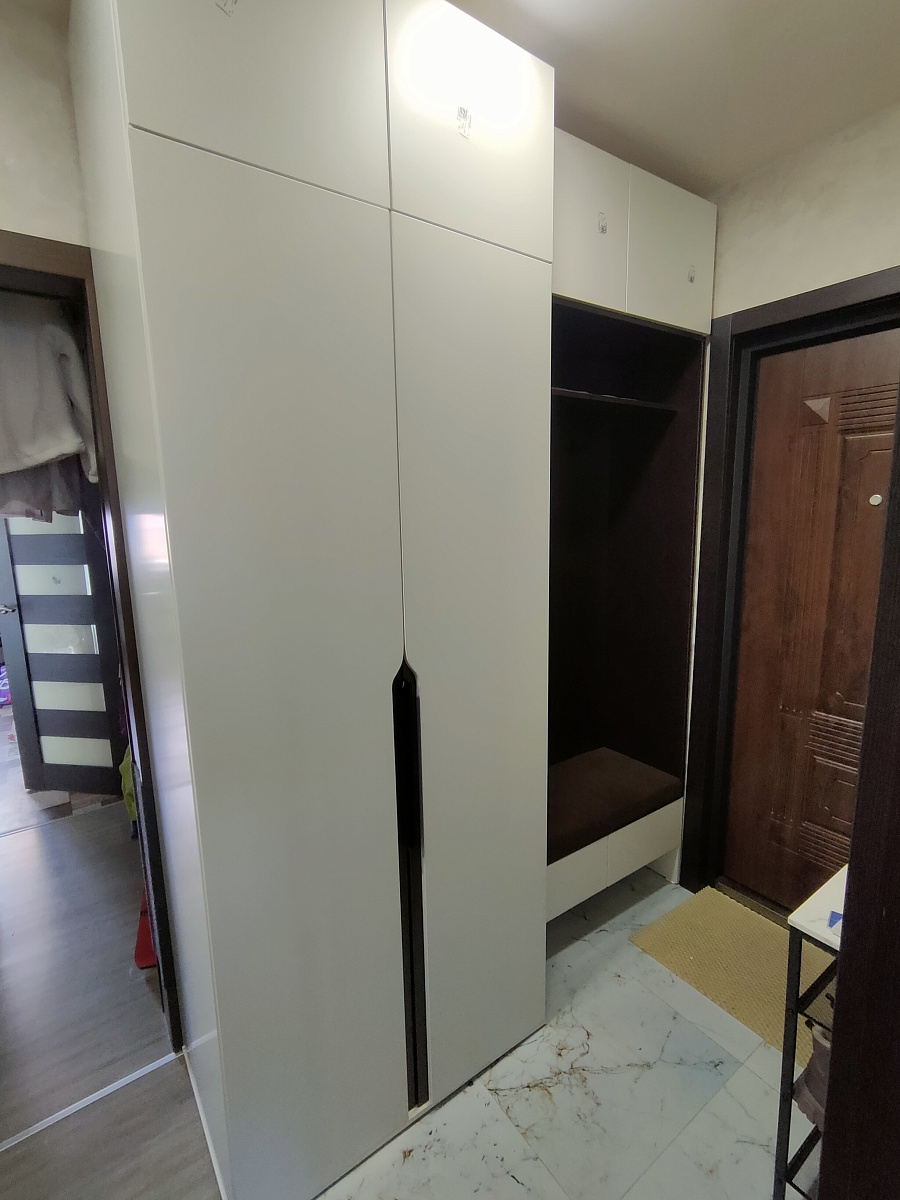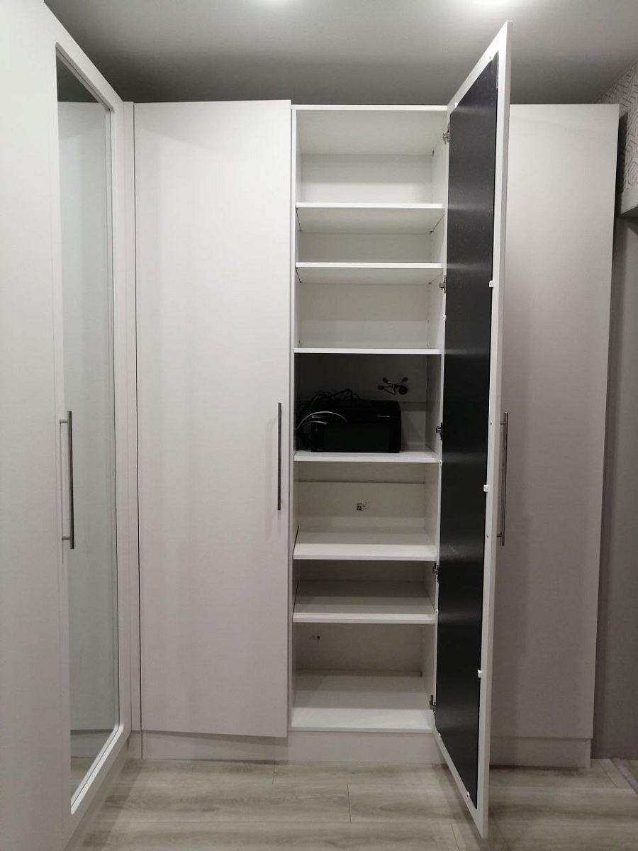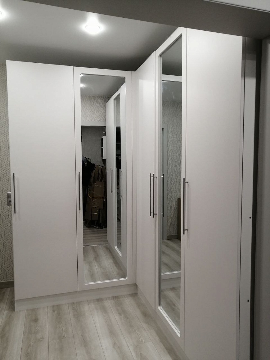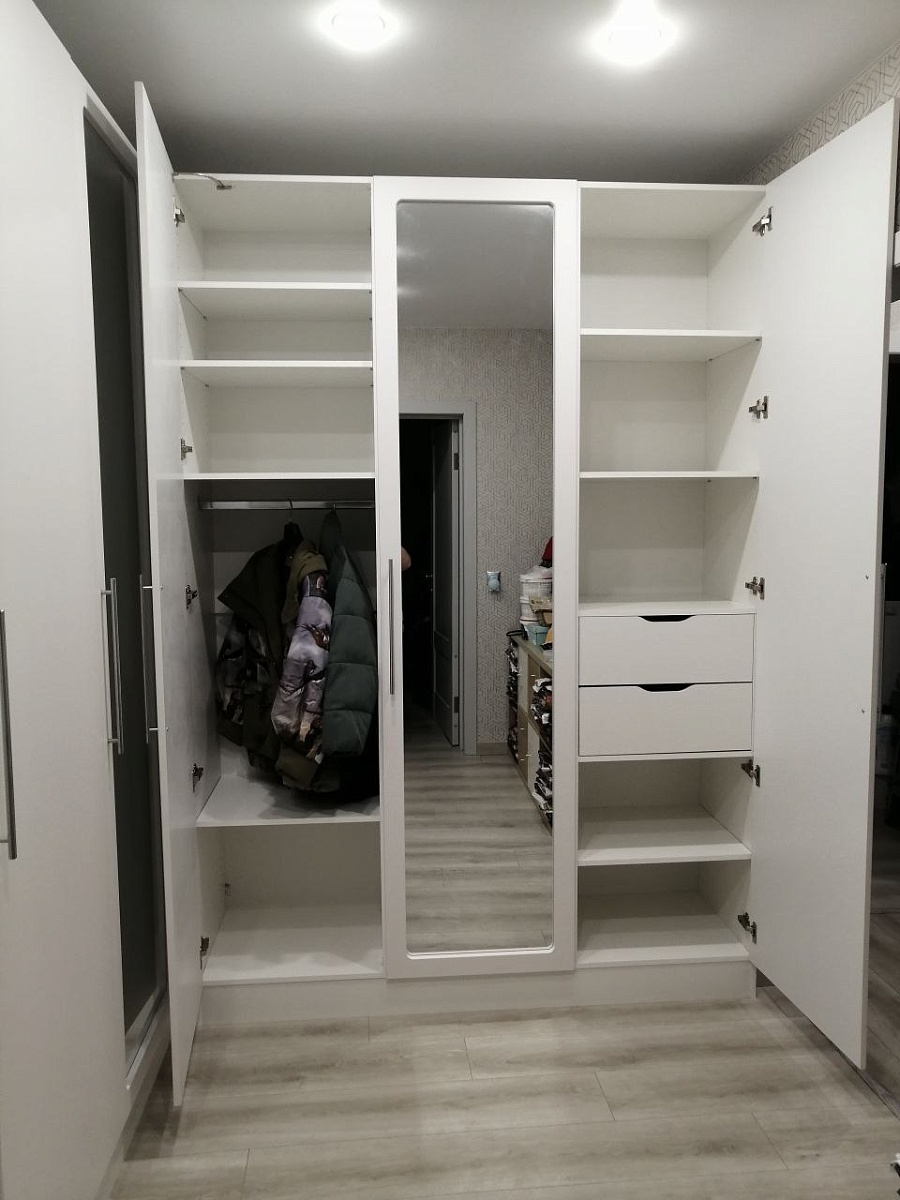 Заказ 00000275042, шкаф распашной Остин Лайт 6 BMS (1700х2500х500). Это не первый мой шкаф с БестМебель. Классно, что можно придумать свое наполнение, очень удобно. В целом качество нормальное, кое-где есть микро сколы, но их видно только при ближайшем рассмотрении, но не при ежедневном использовании. Фурнитура приемлемая, только на верхних полках мы просили не устанавливать пуш-ту-опен механизм, иначе дверцы немного оттопыриваются. Но поскольку туда убраны редко используемые вещи, это не проблема. Так что могу рекомендовать, особенно если требуется какое-то нестандартное исполнение.