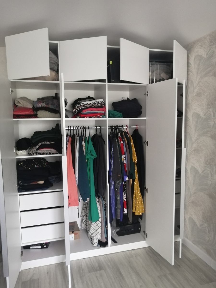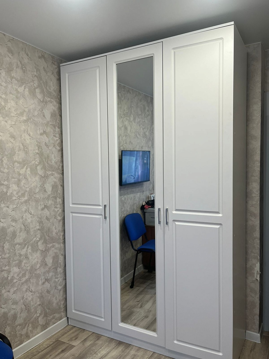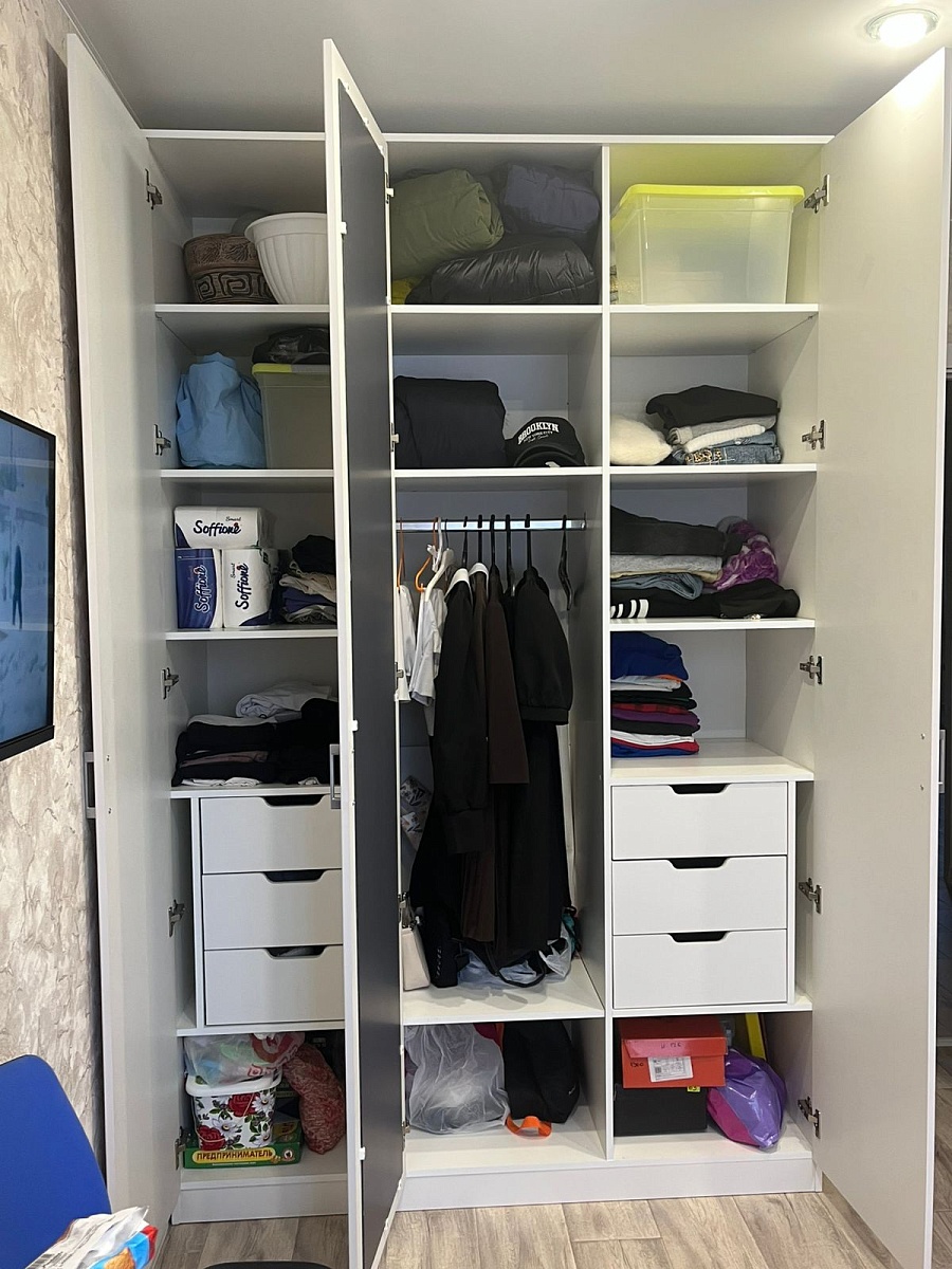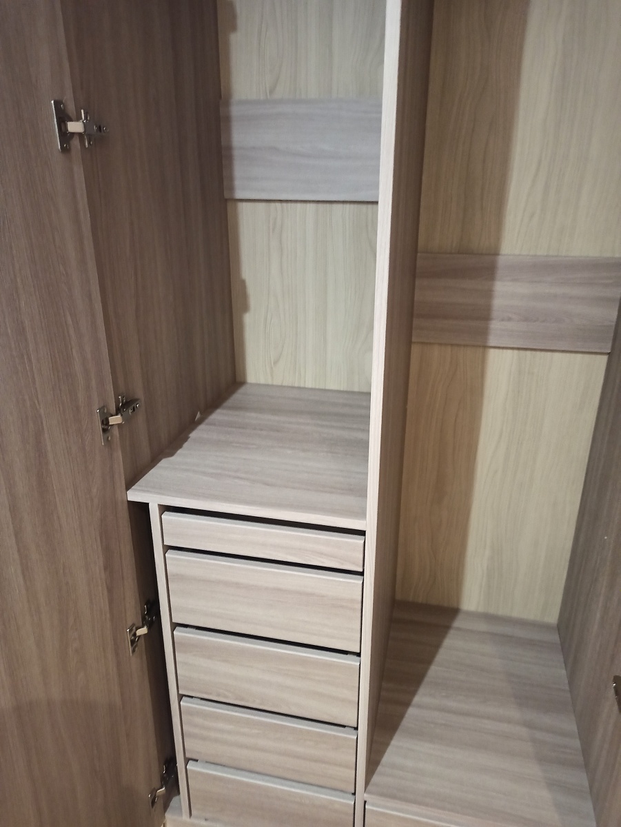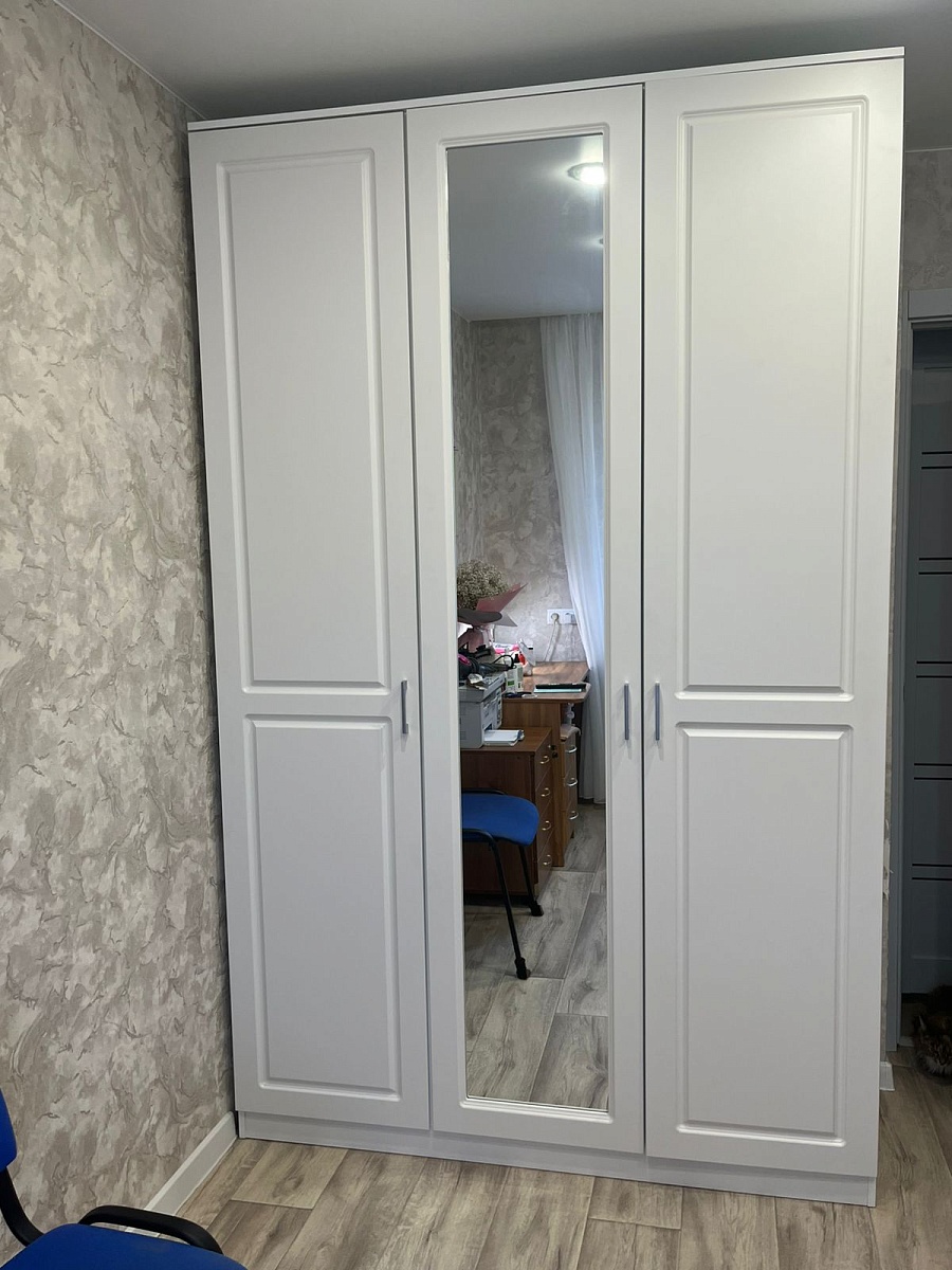 Хороший шкаф. Вместительный. При составлении заказа шкаф был без ножек, но привезли шкаф с ножками и вариант с ножками больше понравился. В отделениях со штангами, добавила ещё по одной штанге. На дверях зеркало не приклеено, сама дверь из зеркала, неожиданно было. Так что, если зеркало вдруг разобьется, будет дыра. Для бюджетного варианта качество хорошее.