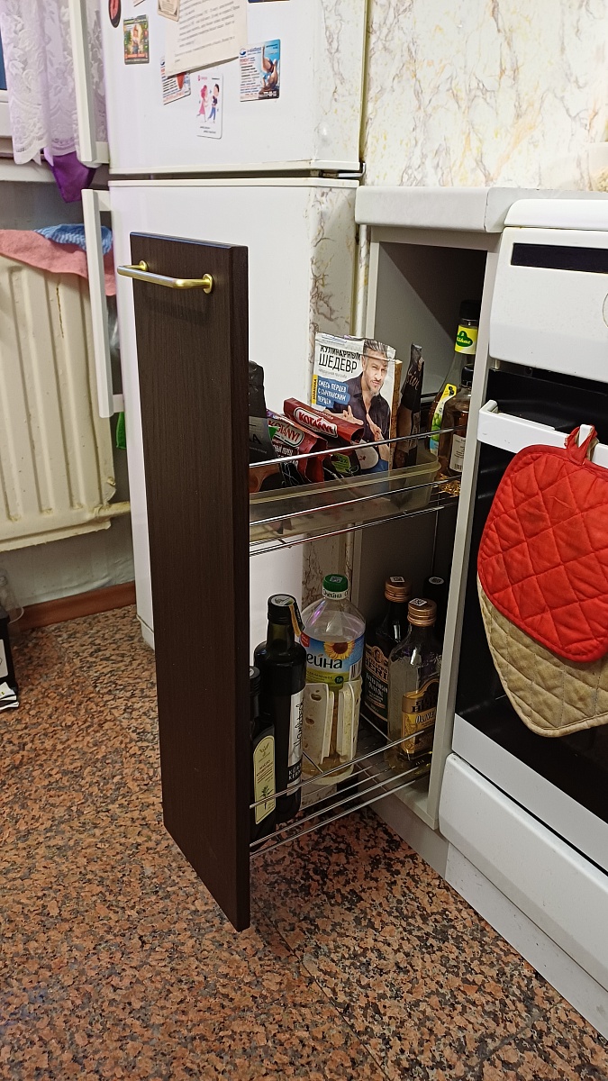 Очень удобно выбирать размер, цвет и фурнитуру бутылочницы. Качество изготовления отличное. Сам шкафчик собрали быстро. Встал на свое место как родной.