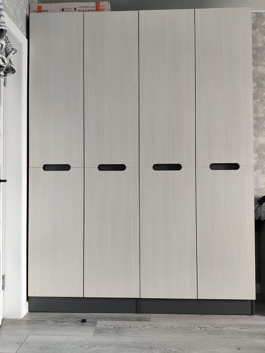 Заказала по своим размерам.Собрала сама,не пригодились полки -ребра жёсткости.Шкаф получился небольшой ,поэтому не было необходимости их крепить.Ножки заказала деревянные,вместо металлических. И....разметка оказалась неправильной .В одно отверстие деревянный дюбель,соединяющий шкаф и ножку попал,а второе отверстие если использовать для скрепления,то ножки смотрели бы не в сторону а внутрь. Пришлось установить как хотелось,ножки наружу...
