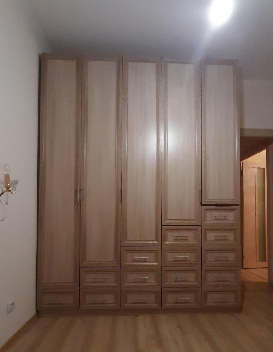 Сделали под мои параметры, довольна всем, согласна с предыдущим отзывом, что зелёное зеркало с обратной стороны шкаф не красит. Очень сложная сборка, собирали сами, запутались с петлями, они оказались разные для разных дверей, в описании  это не было указано. Брали петли с доводчиком, не нарадуюсь. Брали дополнительно штангу в два ряда, нижняя оказалась не удобна, слишком маленькое расстояние, сняла, не пользуемся. Двери были затянуты в плёнку. Трудно оттирать наклейки с деталей. А в целом шкаф красивый, стоит 2 месяца, никаких претензий.