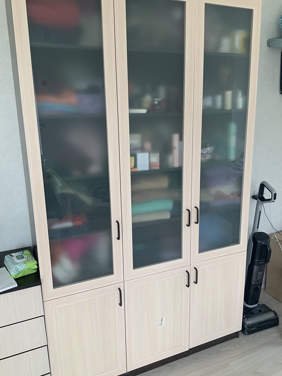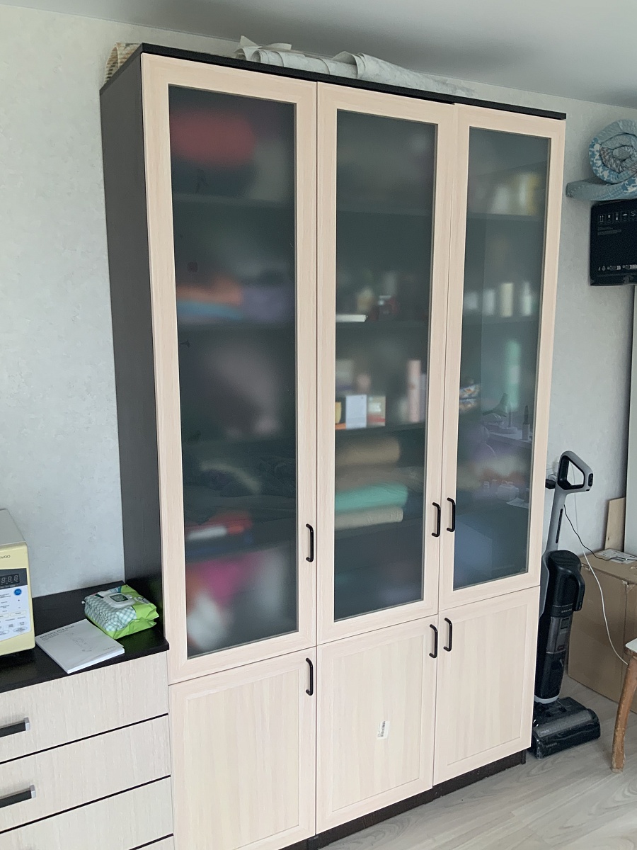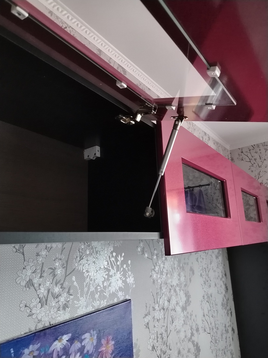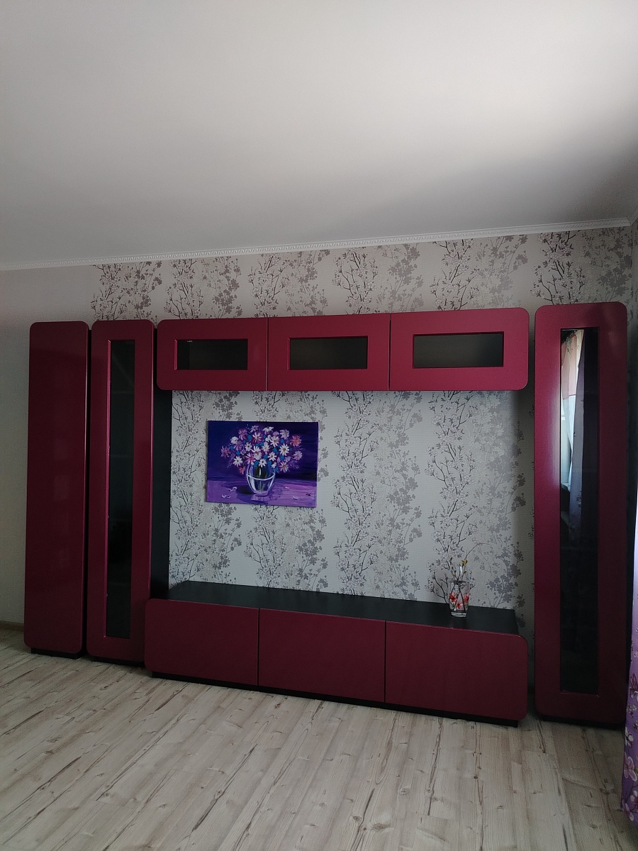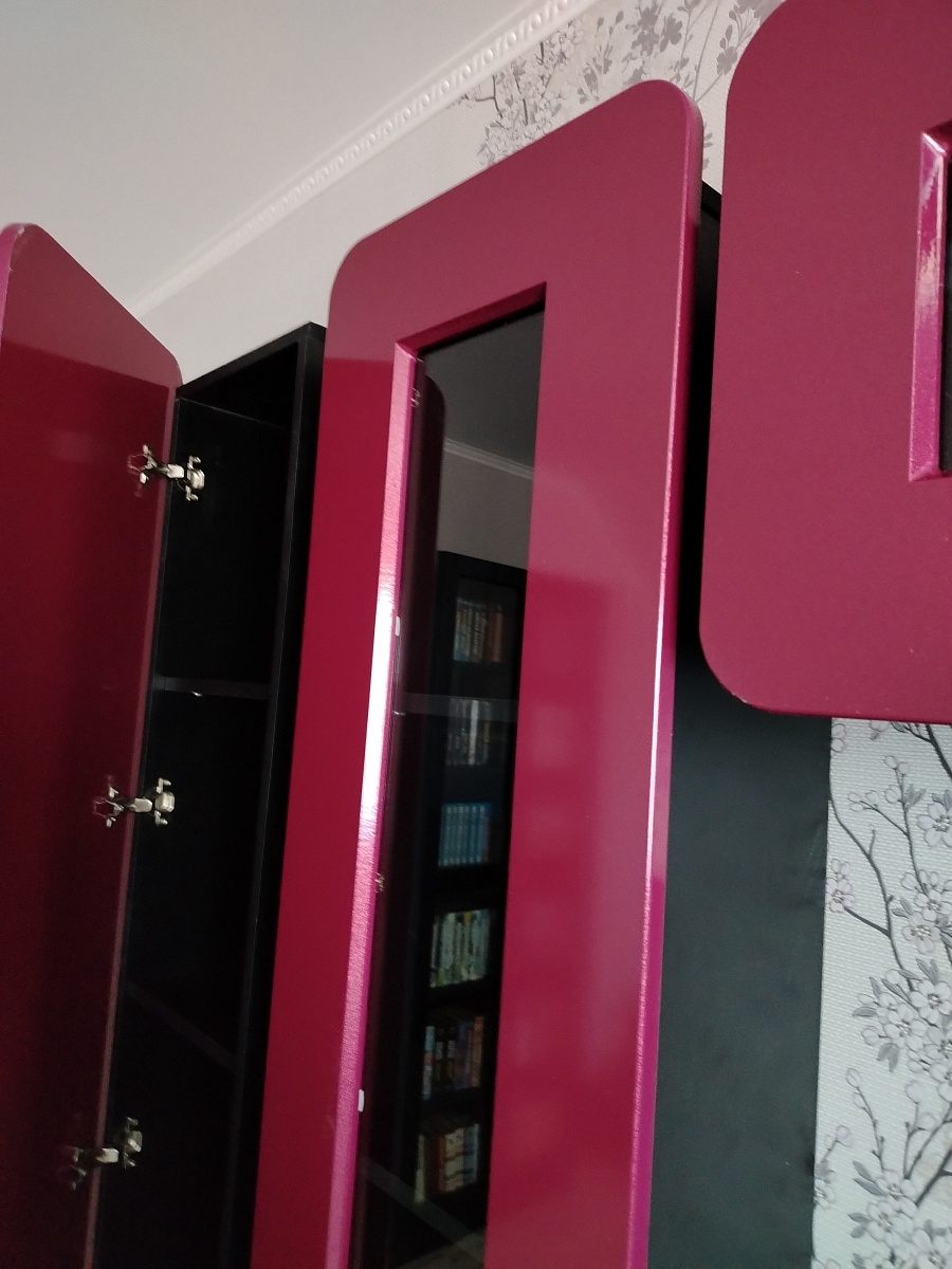 Очень необычная мебель:шкафчики между собой не соединяются, дверцы по всей высоте выступают за корпус и это нужно учитывать при размещении. Мы просто влюбились в эту стенку, очень вкусный цвет фасадов - брусничный металлик, что при чёрных корпусах выглядит эффектно.