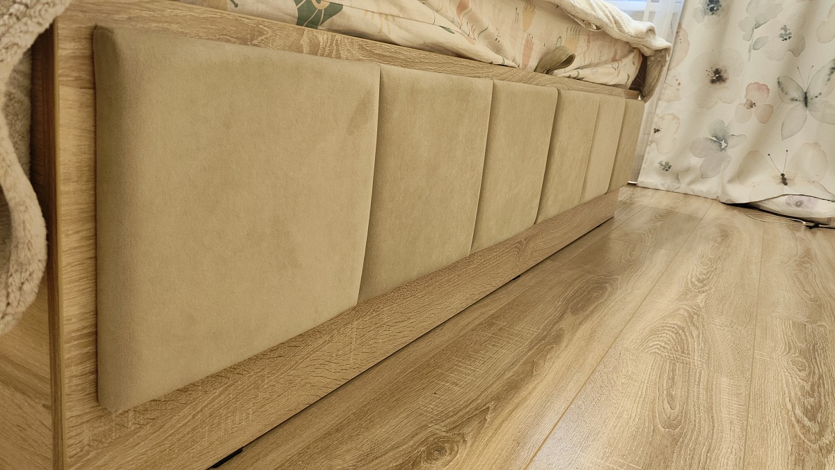 Заказали кровать от спальни Линда (там мягкие вставки), а остальное-серия Прованс.Так понравилось больше.Кровать - с подъемным механизмом, изголовье - взяли нестандартное. Повыше и полочка в изголовье тоже поглубже.В боковых стойках изменили ширину, глубину и высоту от стандартной. Также оставили открытыми только 2 полки.Всё с доводчиками.Что сказать? Собирал я сам. Очень хочется посмотреть в лицо человеку, кто инструкцию по сборке  сделал на четверти листка А4. Если вы привыкли собирать что то икеевское, то Вам потребуется много времени. Про качество: производитель забыл просверлить несколько дырочек. Сверлить пришлось. Справедливости ради - не просверлил только 3 штуки в одной стойке. В принципе - терпимо. По гарантии не обращался.Полик в кровати - из оргалита. под ним мало ребер жесткости. Сейчас он не нагружен особенно, но прогнулся. Если Вы поставите что то тяжелое - проломится.Цена за мебель адекватная, доставка бесплатная, а вот подъем - очень больно  ощутился. В моем случае - было много коробок, подъем на 7 этаж на лифте (лифты пассажирские). Но и стоимость доставки составила более 8 тысяч рублей! Имейте это в виду. Я был на работе в этот день, принять заказ могла только жена и теща. Т.е. вариант с поиском альтернативных вариантов подъема или "затащить самостоятельно" был нереален.Выдержка из правил на сайте: "Для крупногабаритных товаров с кол-вом упаковок 10 и более цена подъема удваивается "Итог: мебель нормальная. внешне - нравится. Цена адекватная.  Но подъем на этаж - неадекватный для заказов, где более 10 коробок.Заказ 00000963665, изделие ИН Спальня (1864х2200х500)