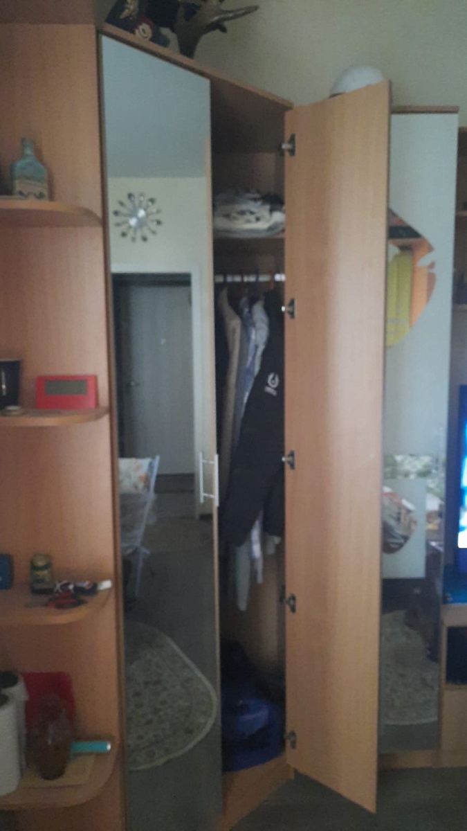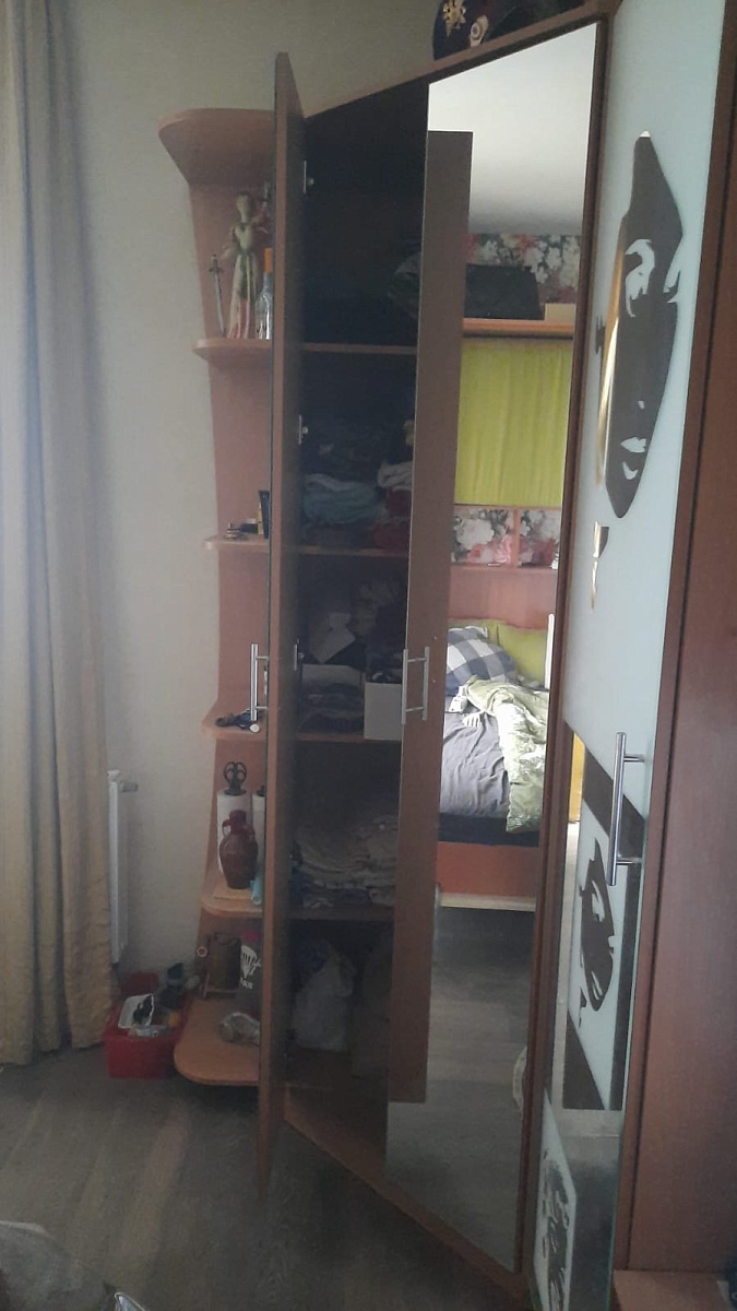 Заказ номер 952753.Отличный шкаф! Дополнили его боковыми полочками. В квартире-студии идеальный вариант! Особенно, когда вымеряешь всё по миллиметрам. Фурнитура качественная - двери с зеркалами достаточно тяжелые, но за несколько лет использования никаких проблем не возникло. Пятерка по всем параметрам!