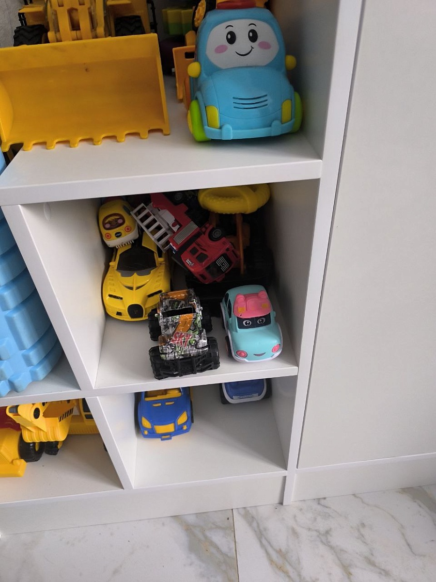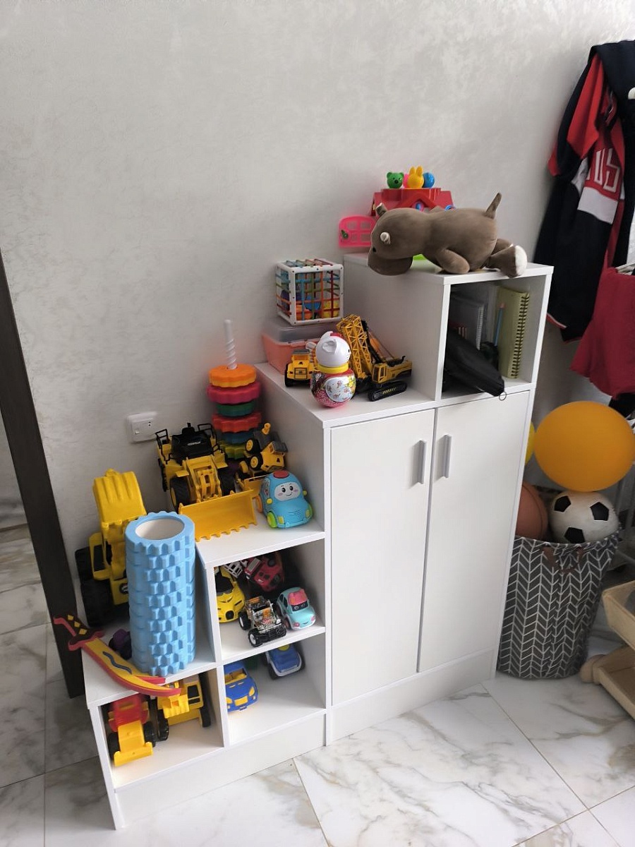 Стеллаж отличный, качество и крепления офигенные. Размер нашего шкафчика 110*120*45. Даже задние стенки не тонкий двп, а полноценные детали шкафчика, что позволяет установить шкаф и поперек комнаты. Но нет подробной инструкции, пришлось помучится со сборкой (сборка идет от низких ящиков). Хотелось бы более подробную что и как собирать. Также не хватило пару саморезов для установки ограничителей.